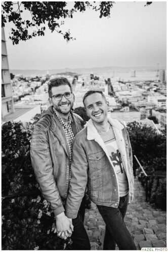 smiling couple against backdrop of san francisco during engagement session