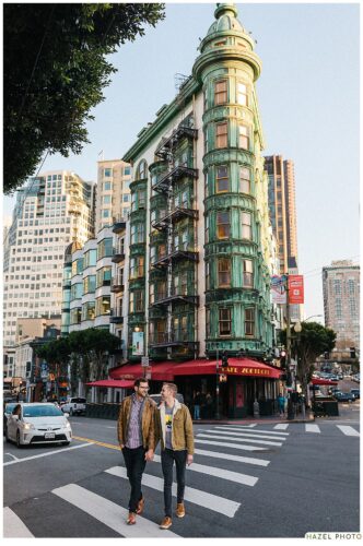 couple crossing the street in jackson square san francisco, historic buildings in the background