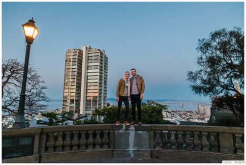 portrait of a couple, san francisco skyline in background, blue hour sunset