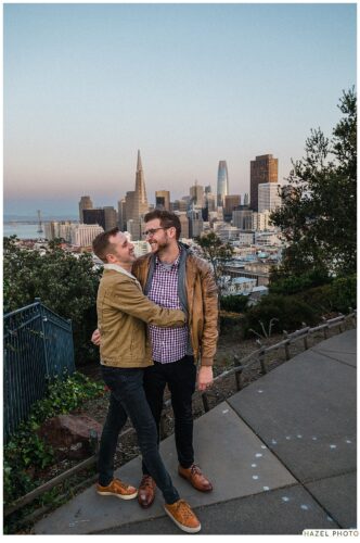 couple hugging during blue hour san francisco engagement session