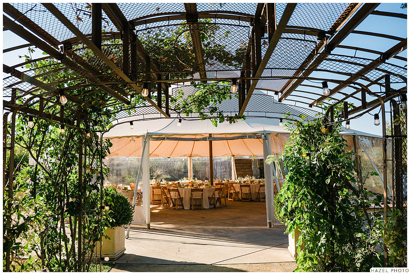 daytime landscape shot of the reception area under a large white tent at cornerstone garden