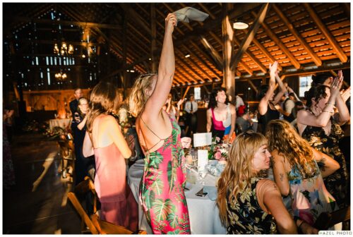 welcoming the newlyweds in the barn, excited guests